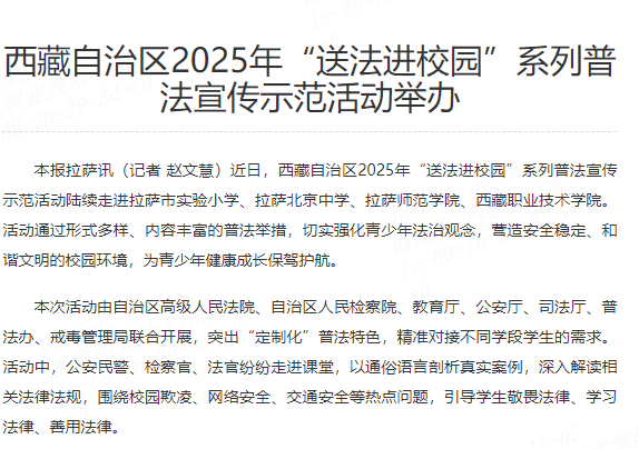 本报拉萨讯(记者 赵文慧)近日,西藏自治区2025年“送法进校园”系列普法宣传示范活动陆续走进拉萨市实验小学、拉萨北京中学、拉萨师范学院、西藏职业技术学院。活动通过形式多样、内容丰富的普法举措,切实强化...