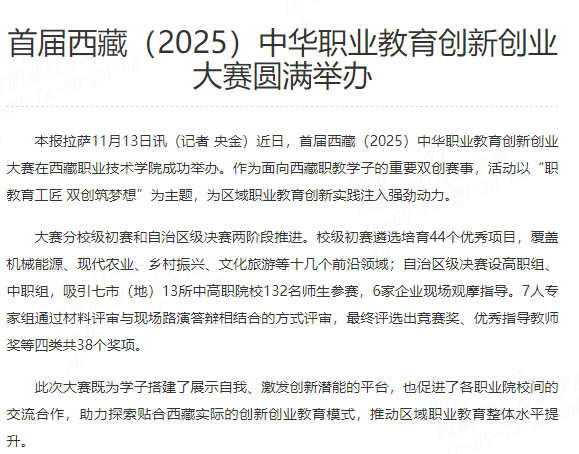 本报拉萨11月13日讯(记者 央金)近日,首届西藏(2025)中华职业教育创新创业大赛在西藏职业技术学院成功举办。作为面向西藏职教学子的重要双创赛事,活动以“职教育工匠 双创筑梦想”为主题,为区域职业教育创...