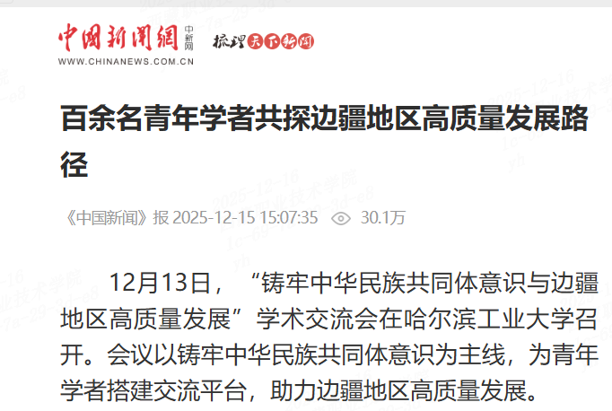 12月13日,“铸牢中华民族共同体意识与边疆地区高质量发展”学术交流会在哈尔滨工业大学召开。会议以铸牢中华民族共同体意识为主线,为青年学者搭建交流平台,助力边疆地区高质量发展。第七次全国人口普查数据显...
