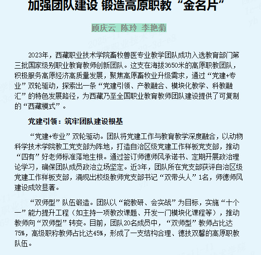2023年,西藏职业技术学院畜牧兽医专业教学团队成功入选教育部门第三批国家级别职业教育教师创新团队。这支在海拔3650米的高原职教团队,积极服务高原经济高质量发展,聚焦高原畜牧业升级需求,通过“党建+专业”...