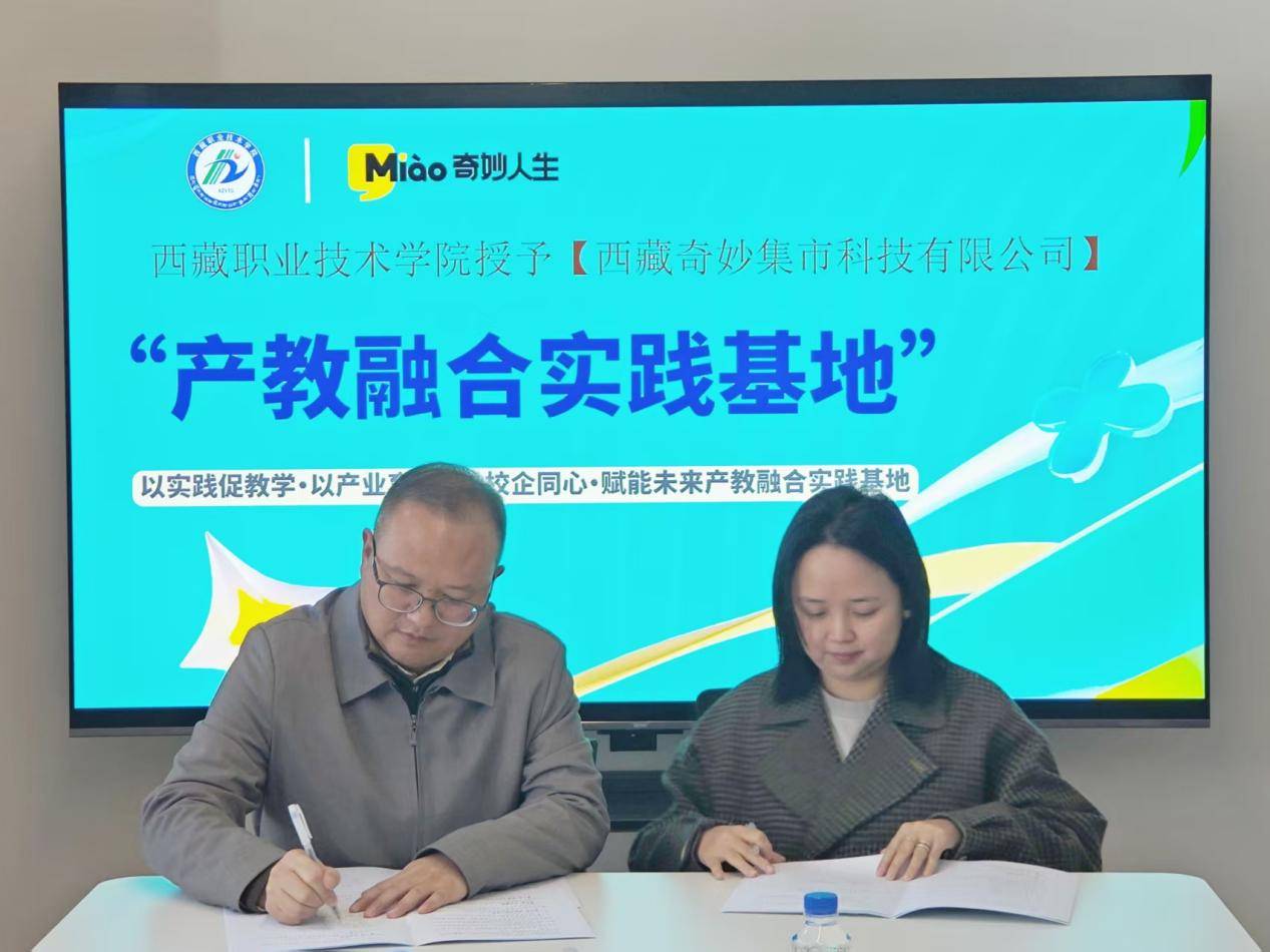 为深化产教融合、加强校企合作、拓宽就业渠道,助力我校毕业生高质量充分就业。2025年11月3日下午,陈飞校长带队前往西藏奇妙集市科技有限公司举行校企合作框架协议签约仪式暨“产教融合实践基地”揭牌仪式。会议由西藏奇妙集市科技有限公司陈瑛主持,董事长金丹等出席会议。