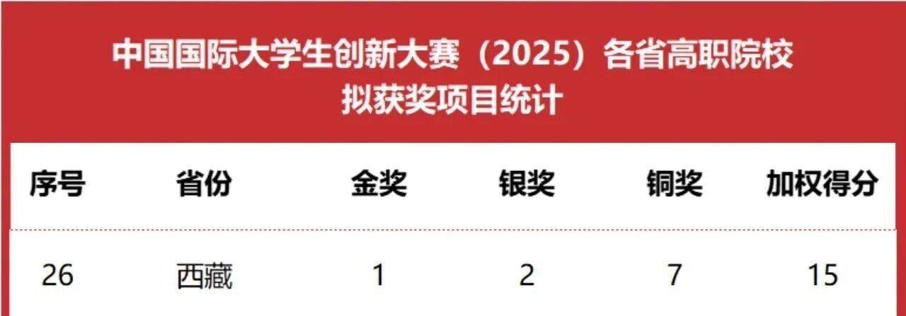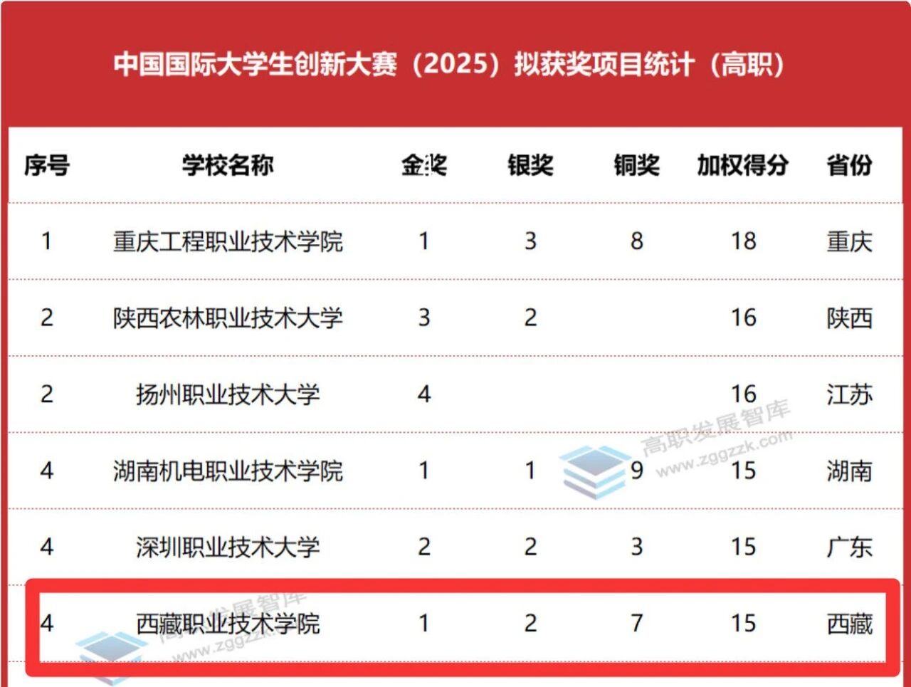 考虑到不同级别奖项的获奖难易程度和价值,高职发展智库对其赋予不同的权重,具体赋权情况为:金奖4倍权重,银奖2倍权重,铜奖按照实际获奖数量计算。从统计结果来看,西藏职业技术学院加权得分15分,并列全国第三。
