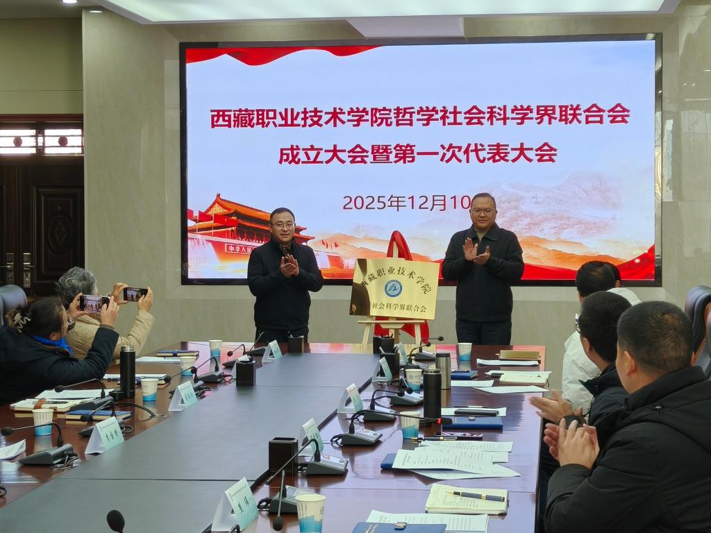 2025年12月10日,西藏职业技术学院哲学社会科学界联合会成立大会暨第一次代表大会成功召开。自治区社科院党组成员、副院长、社科联副主席(候选人)刘炳江出席并讲话,西藏职业技术学院党委副书记、校长陈飞致辞,刘炳江同志与陈飞同志一道为“西藏职业技术学院哲学社会科学界联合会”揭牌。西藏职业技术学院副校长陈文青同志出席,西藏职业技术学院副校长程雪松同志主持会议。