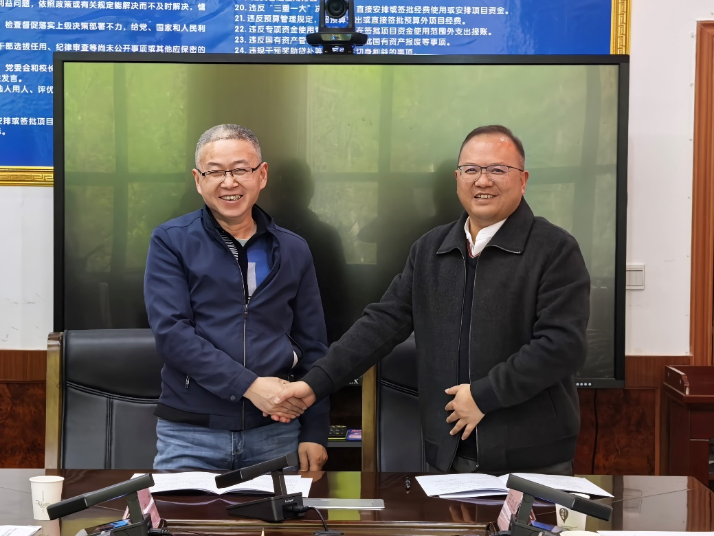 图为陈飞校长与刑震副校长签署两校本科层次人才培养合作协议