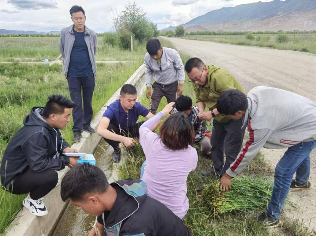 图1:刘海聪教授团队正带着草业技术专业学生俯身进行饲草测产