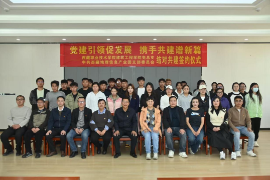 2025年10月27日下午,西藏职业技术学院建筑工程学院党总支与中共地理信息产业园支部委员会党组织结对共建框架协议签约仪式在拉萨市达孜区地理信息产业园顺利举行。本次仪式以“党建引领促发展,携手共建谱新篇,深化产教融合,共筑育人高地”为主题,是落实新时代党的建设要求、深化产教融合的关键举措,也是推动西藏建筑产业高质量发展、铸牢中华民族共同体意识的具体行动。西藏职业技术学院党委书记、副校长索旺,地信协会会长韩剑侠及数十家企业代表,建筑工程学院领导班子成员、地信教育教学负责人和24级测绘班全体学生共同参加了活动。