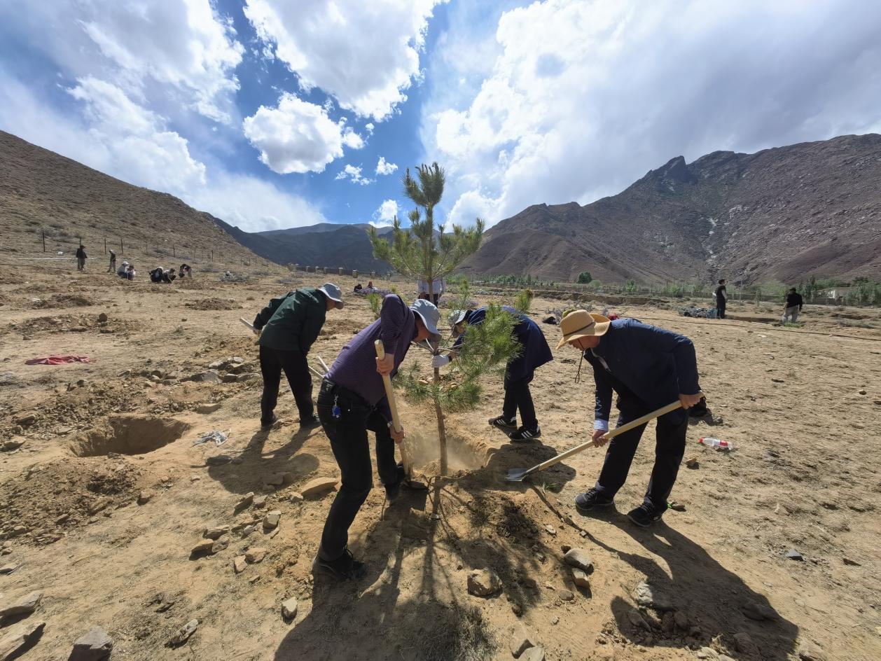 在学生劳动实践现场,三位院领导及陪同考察人员相互配合,挥锹铲土,扶植苗木,认真完成每一道工序,以实际行动带领广大青年学生积极履行植树义务,为西藏增绿添彩。