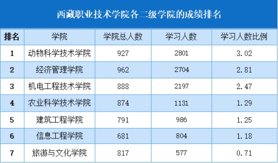 在2023年第六期青年大学习网上团课的学习中,我校在全区高校中排名第一,获得的成绩来源于七个二级学院的不懈努力。动物科学技术学院、经济管理学院、机电工程技术学院、农业科学技术学院、建筑工程学院、信息工程学院学习率均达到100%,值得表扬!其中动物科学技术学院在青年大学习中以3.02的学习人数比例夺冠。旅游与文化学院遗憾底,青年大学习人数比例只达到071。希望在下期的青年大学习当中旅游与文化学院认真学习,争取有较好的成绩。