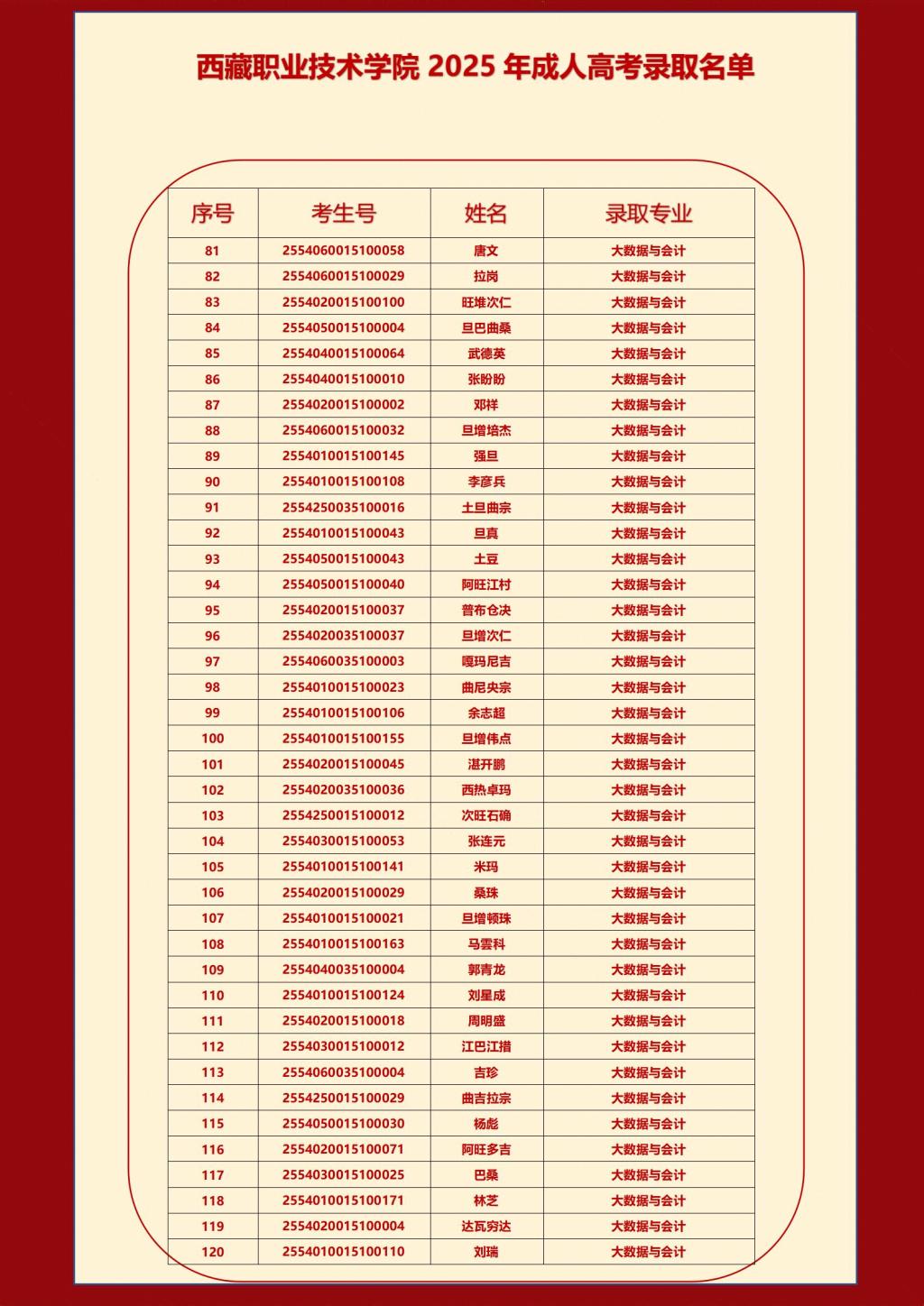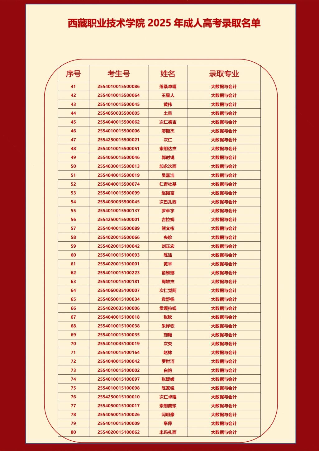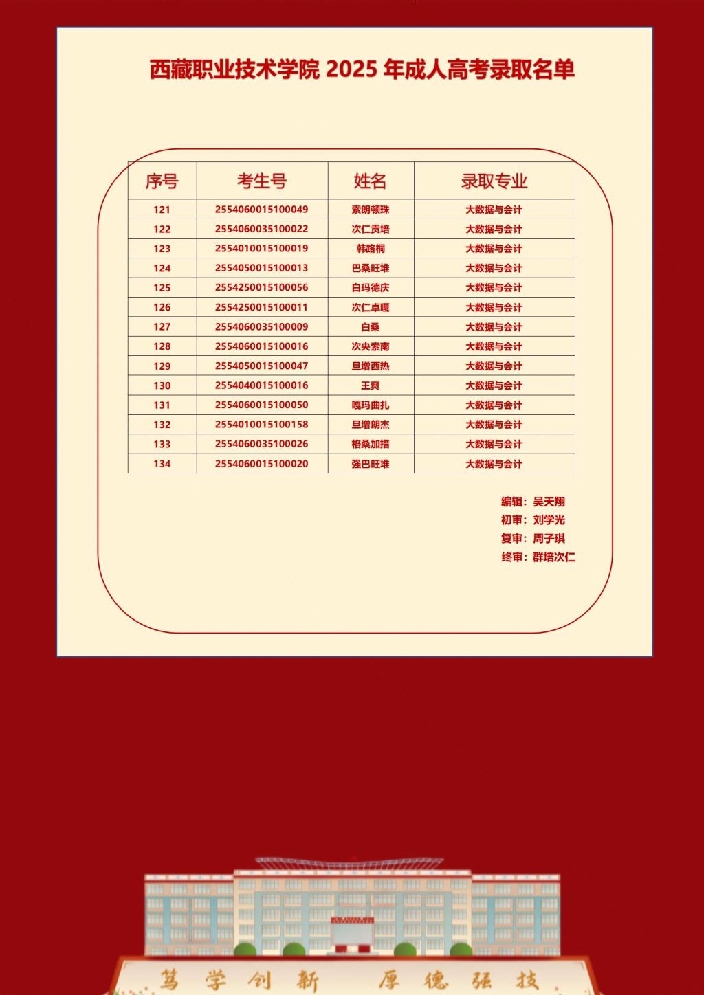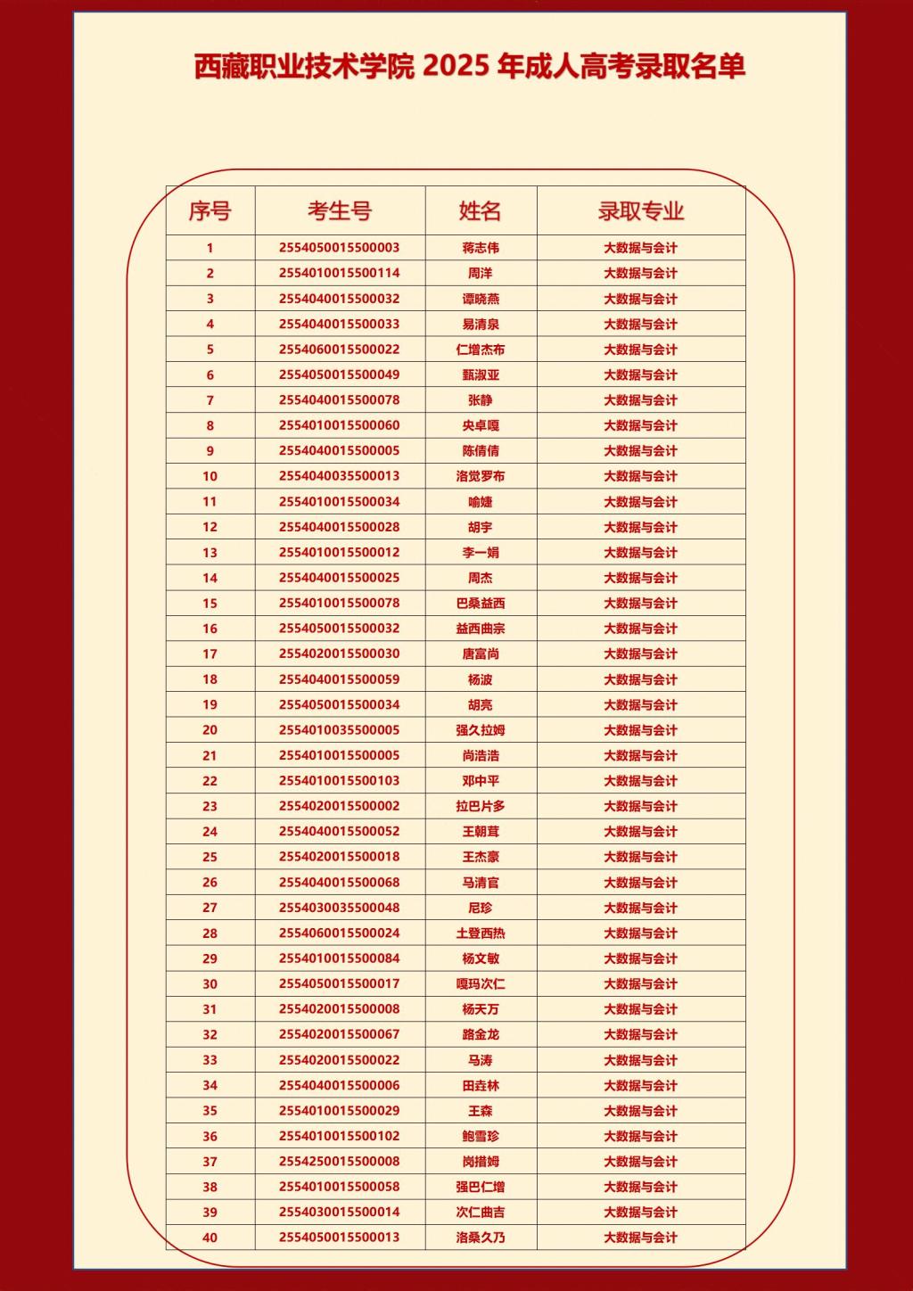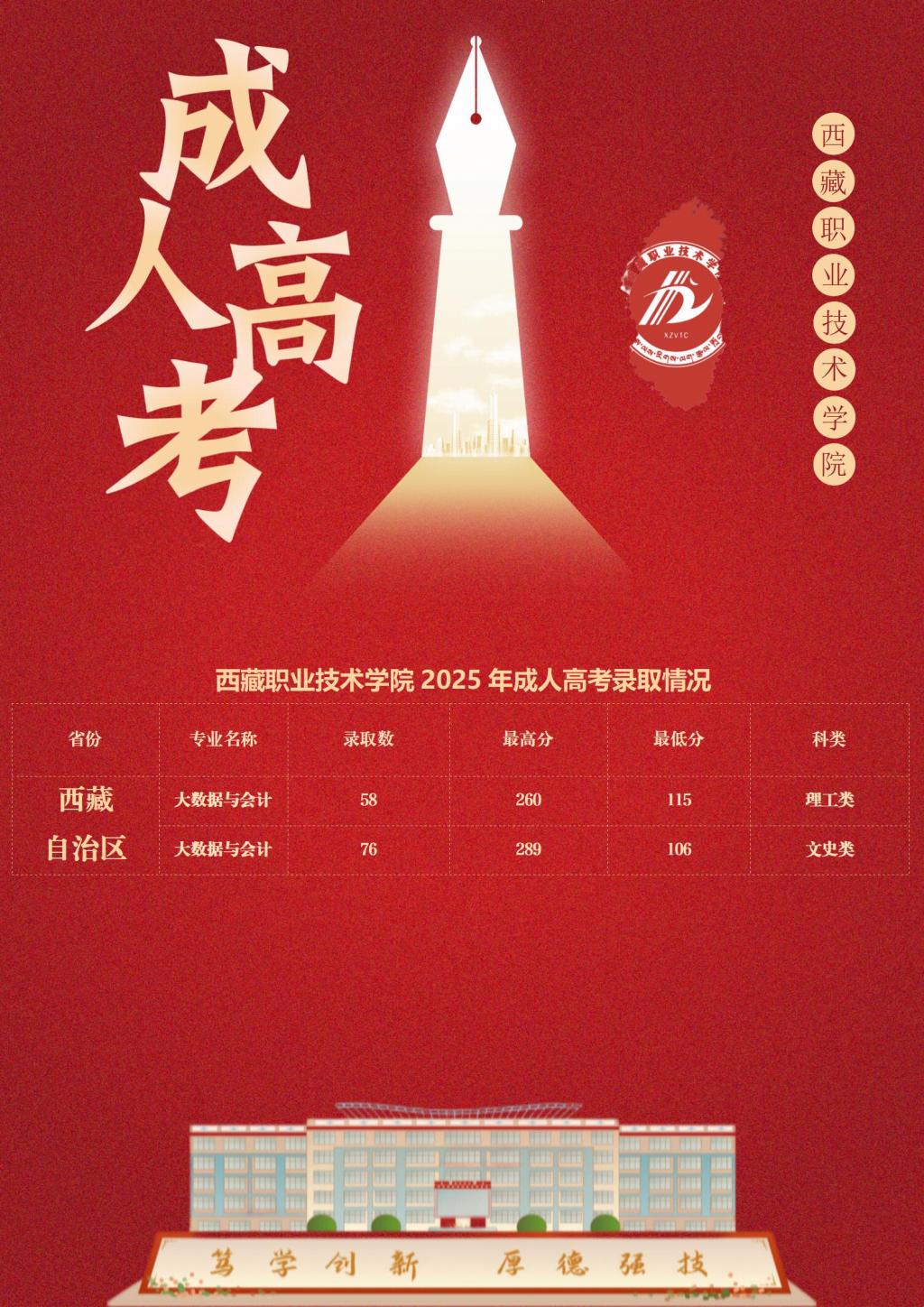 西藏职业技术学院2025年成人高考录取情况(大数据与会计)